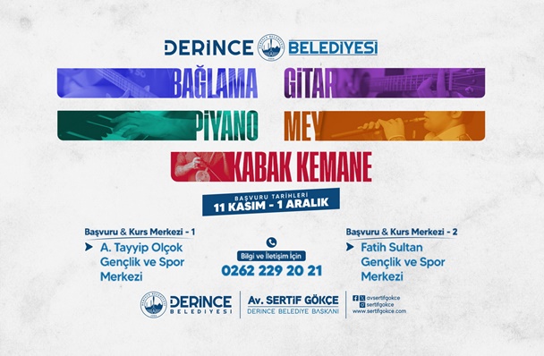 Hayata geçirdiği uygulamalarla Derince’yi eğitim, kültür, sanat, spor ve müzik kenti yapmaya kararlı olan Derince Belediye Başkanı Av. Sertif Gökçe öncülüğünde ilçede bu kez müzik kursları başlıyor. Derince Belediyesi sosyal medya hesaplarından yapılan duyuruda bağlama, gitar, piyano, mey ve kabak kemane kursları için başvuruların alınmaya başlandığı açıklandı.