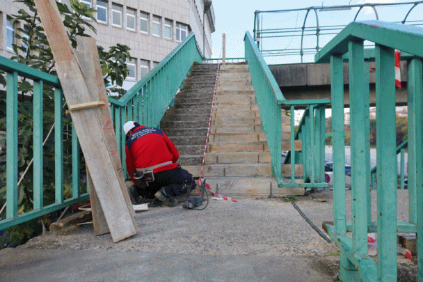 Büyükşehir Belediyesi Yol Yapım, Bakım ve Onarım Dairesi Başkanlığı’na bağlı A Takımı ekiplerince başlatılan çalışma doğrultusunda, eskiyen ve kullanılmaz hale gelen üst geçidin basamaklarındaki betonlar söküldü. Zemin düzenlemesinin ardından beton atılarak, merdiven basamakları yenilendi.