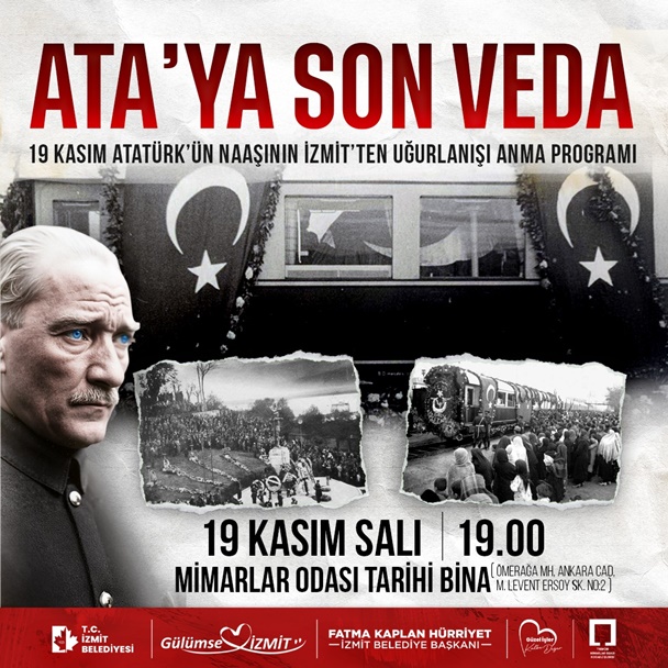 İzmit Belediyesi, Türkiye Cumhuriyeti’nin kurucusu Mustafa Kemal Atatürk’ün naaşının İzmit Tren Garı’ndan Ankara Etnografya Müzesi’ne uğurlanışının 86. yıldönümünde, onun anısına anlam dolu bir anma programı düzenliyor. Bu özel program, Atatürk’ün hatırasını İzmit halkıyla birlikte yaşatmak amacıyla, 19 Kasım Salı günü saat 19.00’da Mimarlar Odası Tarihi Binada gerçekleşecek.