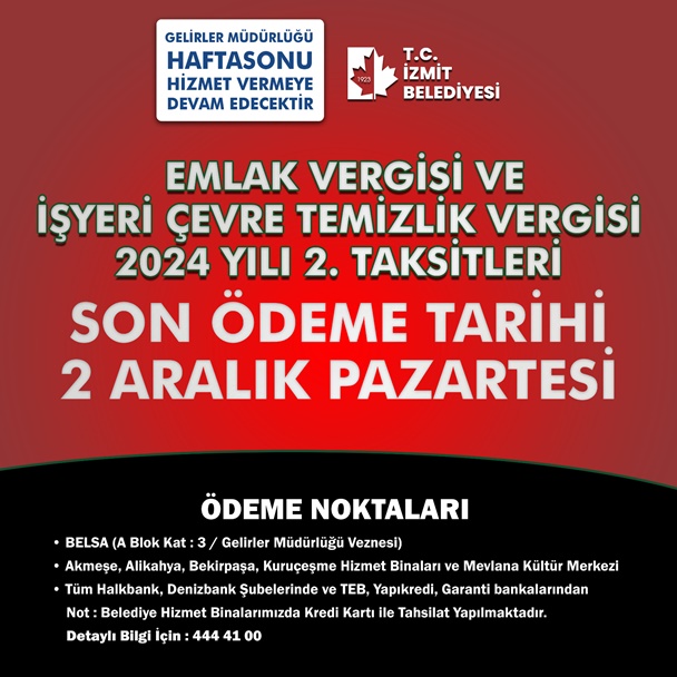 2024 yılına ait Emlak Vergisi ve İşyeri Çevre Temizlik Vergilerinin ikinci taksit ödemeleri 2 Aralık Pazartesi günü sona erecek. Mükellefler, vergi borçlarının taksitlerini İzmit Belediyesi Gelirler Müdürlüğüne, Kaymakamlık (Bekirpaşa), Mevlana Kültür Merkezi ve Kuruçeşme Hizmet Binasında bulunan veznelere yatırabilecek.