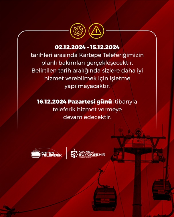 Kocaeli Büyükşehir Belediyesi iştiraki UlaşımPark tarafından işletilen Kartepe teleferik hattı bakıma alınıyor. Kuzuyayla’ya güvenli ve konforlu ulaşımın sürmesi amacıyla gerçekleştirilecek olan bakım süresince teleferik hattı kapalı olacak.