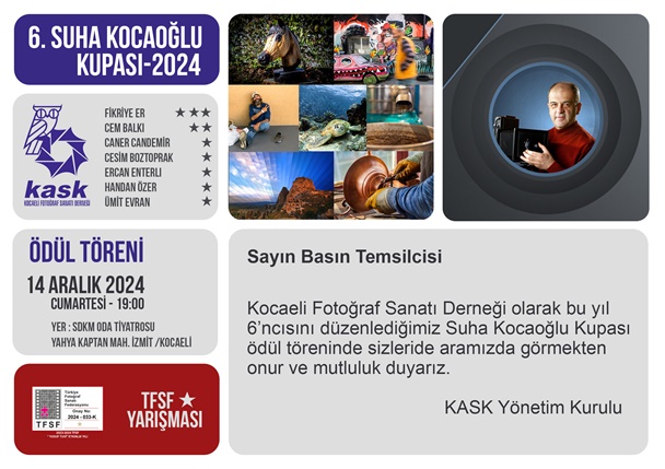 Bu özel kupanın ödülleri 14 Aralık 2024 Cumartesi saat 19:00’da Süleyman Demirel Kültür Merkezi’nde yapılacak fotoğraf sergisi ve sunumlarının hemen ardından törenle verilecektir. 44 yıldır kentimize sayısız hizmetler veren Kocaeli Fotoğraf Sanatı Derneği (KASK) tarafından yapılacak Suha Kocaoğlu Kupası ödül törenine tüm halkımız davetlidir.