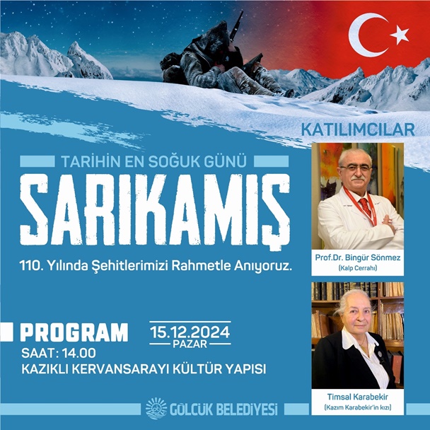 Binlerce kahraman Türk askerinin şehit olduğu Sarıkamış harekâtının 110. yılı etkinlikleri kapsamında; Gölcük Belediyesi’nin ev sahipliğinde, 15 Aralık Pazar günü saat 14.00’da, Kervansaray Kültür Yapısı’nda “Tarihin En Soğuk Günü” konulu söyleşi düzenlenecek. Prof. Dr. Bingür Sönmez, Kurtuluş Savaşı'nın kahraman komutanları arasında yer alan Kazım Karabekir’in kızı Timsal Karabekir’in katılacağı söyleşide, harekâtın önemi ve harekât sırasında yaşananlar hakkında katılımcılara önemli bilgiler aktarılacak.
