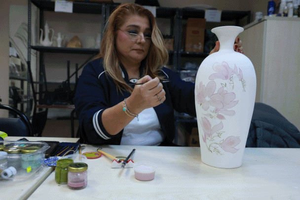 Emekli olduktan sonra yıllardır gitmek için fırsat kolladığı çini işlemeciliği kursuna başlamaya karar veren Ferhunde Kasap, hobi olarak başladığı kursta artık yaptığı ürünlerini satarak ev ekonomisine katlı sağlıyor. “Bu işi öğrenir, yaptıklarımı yakın çevreme hediye ederim” diye yola çıkan Kasap’ın yaptığı bir ürünün çok beğenilip satın alınması bu işe dört elle sarılmasına teşvik oldu.
