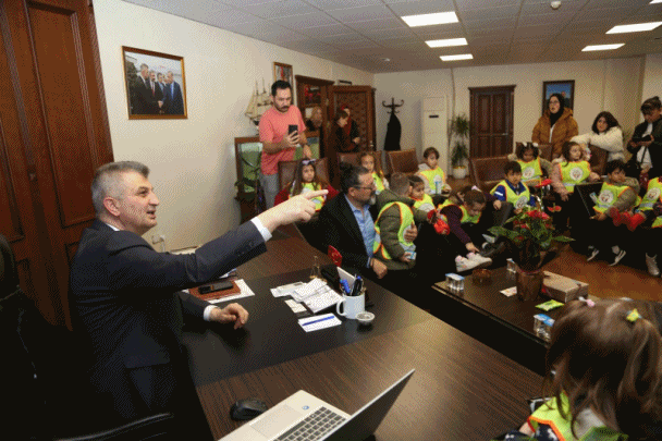 Gölcük Belediye Başkanı Ali Yıldırım Sezer, Demokrasi ve İnsan Hakları Haftası kapsamında Düzağaç Anaokulu öğrencilerini makamında misafir etti. Sürpriz bir ziyaretle Gölcük Belediyesi’ne gelen öğrenciler, kendi elleri ile çizdikleri renkli kalpleri Başkan Sezer’e hediye ettiler. Öğretmenleri ile birlikte minik öğrencileri makamında ağırlayan Sezer, hediyeleri için teşekkür etti.