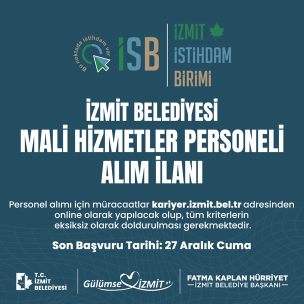 İzmit Belediyesi tarafından ( 5 Ay 29 Gün ) istihdam edilmek üzere, “Mali Hizmetler Personeli’’ alımı yapılacak. İlanla ilgili yapılan açıklamada, “Kurumumuz bünyesinde görev alabilecek, aşağıdaki niteliklere sahip “gülümseyen” ve “İzmit’ İ Çok Seven” çalışma arkadaşları arıyoruz. Personel alımı için müracaatlar 27/12/2024 tarihine kadar kariyer.izmit.bel.tr adresine online olarak yapılacak olup, tüm kriterlerin eksiksiz olarak doldurulması gerekmektedir” ifadeleri kullanıldı.