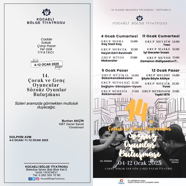 Kocaeli’de tiyatro denilince ilk akla gelen isim olan Kocaeli Bölge Tiyatrosun Genel Sanat Yönetmeni Burhan Akçin herkesi festival etkinliklerine davet etti. Dolphin Alışveriş Merkezi’nde gerçekleştirilecek bu festivalde ilk oyun 4 Ocak Cumartesi günü saat 14.00’de başlayacak.