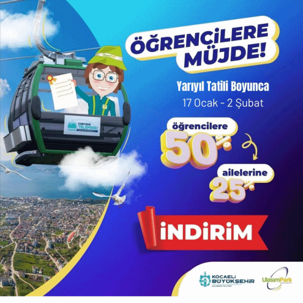 Karnesini yanında getirerek Kartepe Teleferiği’ne binecek öğrencilere yüzde 50, ailelerine ise yüzde 25 indirim uygulanacak. İndirimli seyahat edecek öğrenciler, doğanın, Sapanca Gölü’nün ve şehir manzarasının eşliğinde Kuzu Yayla’ya çıkacak. İndirimli uygulama 17 Ocak-02 Şubat tarihleri arasında geçerli olacak.