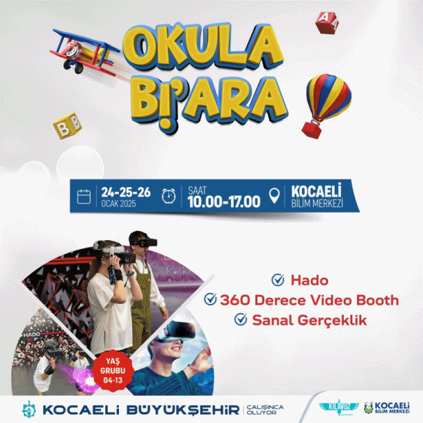 Yarıyıl tatilinde birbirinden keyifli aktivitelerle 4-13 yaş aralığındaki çocuklara hem eğlenceli hem de öğretici bir deneyim sunan Kocaeli Bilim Merkezi etkinlik programlarını açıkladı. 24-25-26 Ocak tarihlerinde 10.00-17.00 saatleri arasında gerçekleştirilecek “Okula Bi’ Ara” etkinliğinde eğitici dene-yap atölyeleri, eğlenceli sahne şovları, spor etkinlikleri, sanal gerçeklik deneyimleri ve interaktif oyun alanları ile çocuklar Bilim Merkezi’nin ilgi çekici dünyasında bilim ve teknolojiye dair keyifli deneyimler yaşayacak.