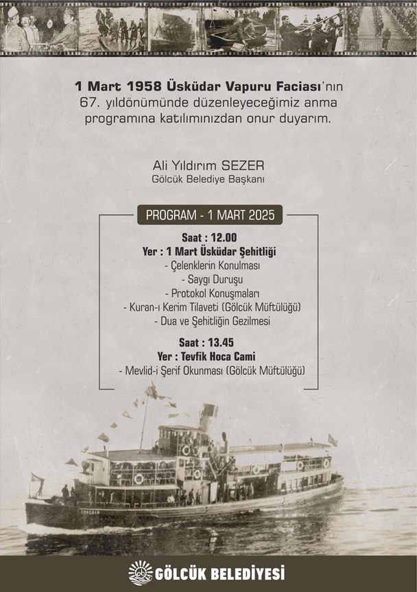 Türkiye Cumhuriyeti tarihinin en ölümcül sivil deniz kazası olan Üsküdar Vapuru faciasının acısı; aradan geçen yıllara rağmen Kocaeli’de tazeliğini korumaya devam ediyor. 1 Mart 1958 tarihinde İzmit-Gölcük seferini yaptığı sırada şiddetli rüzgâr sebebiyle Derince açıklarında batan Üsküdar Vapuru’nda hayatlarını kaybeden 392 kişi, Gölcük Belediyesi’nin düzenleyeceği programda dualarla anılacak.