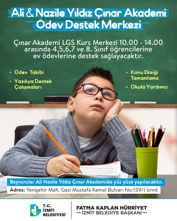 Yeni açılan amacıyla Ali & Nazile Yıldız Çınar Akademi Ödev Destek Merkezi’nde 4, 5, 6, 7 ve 8. sınıf öğrencilerine yönelik olarak faaliyet gösterecek merkezde, öğrencilerin okul derslerine yardımcı olacak çalışmalar gerçekleştirilecek. Öğrencilerin eğitim süreçlerini daha verimli hale getirmeyi amaçlayan merkezde, uzman eğitmenler eşliğinde ödev takibi, yazılılara hazırlık çalışmaları, konu eksiği tamamlama ve okula yardımcı destek sunulacak.
