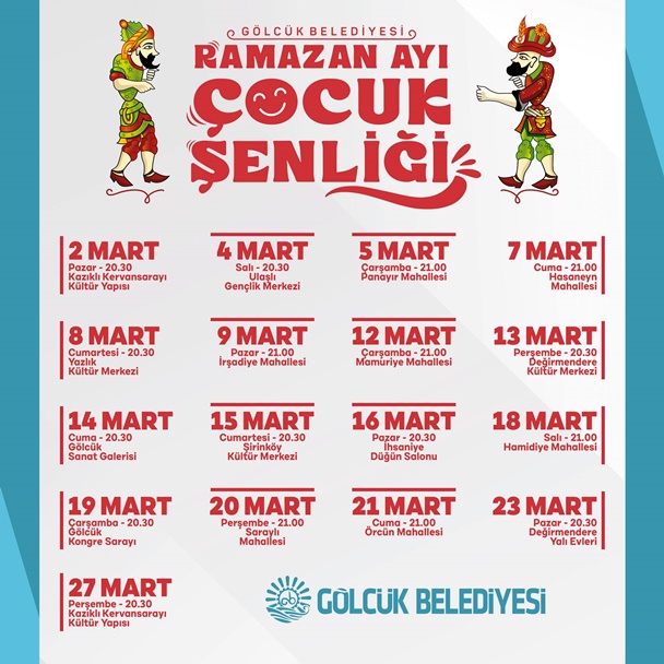 Ramazan ayı Çocuk Şenlikleri; 2 Mart 2025 Pazar saat 20.30’da Kazıklı Kervansarayı Kültür Yapısı, 4 Mart 2025 Salı günü saat 20.30 Ulaşlı Gençlik Merkezi, 5 Mart 2025 Çarşamba günü saat 21.00’da Panayır Mahallesi, 7 Mart 2025 Cuma günü saat 21.00’da Hasaneyn Mahallesi, 8 Mart 2025 Cumartesi saat 20.30 Yazlık Kültür Merkezi, 9 Mart 2025 Pazar günü saat 21.00’da İrşadiye Mahallesi, 12 Mart 2025 Çarşamba günü saat 21.00’da Mamuriye Mahallesi, 13 Mart 2025 Perşembe saat 20.30’da Değirmendere Kültür Merkezi, 14 Mart 2025 Cuma günü saat 20.30’da Gölcük Sanat Galerisi, 15 Mart 2025 Cumartesi günü saat 20.30’da Şirinköy Kültür Merkezi, 16 Mart 2025 Pazar günü saat 20.30’da İhsaniye Düğün Salonu, 18 Mart 2025 Salı günü saat 21.00’da Hamidiye Mahallesi, 19 Mart 2025 Çarşamba günü saat 20.30’da Gölcük Kongre Sarayı, 20 Mart 2025 Perşembe günü saat 21.00’da Saraylı Mahallesi, 21 Mart 2025 Cuma günü saat 21.00’da Örcün Mahallesi, 23 Mart 2025 Pazar günü saat 20.30’da Değirmendere Yalı Evleri’nde çocuklarla buluşarak, 27 Mart 2025 Perşembe günü saat 20.30’da Kazıklı Kervansarayı Kültür Yapısı’nda sona erecek.