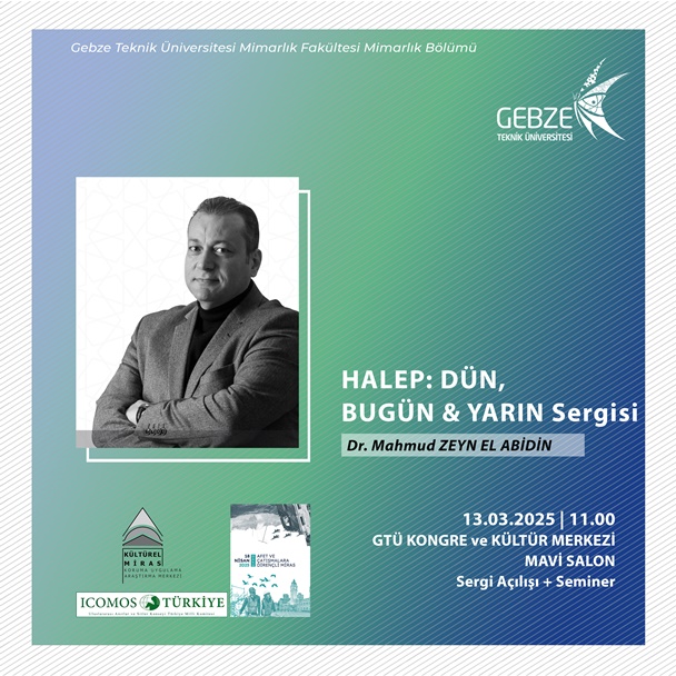 Suriye iç savaşı nedeniyle Halep'in kültürel mirası büyük zarar görmüş ve çok sayıda yapı tahrip olmuştur. Tarih boyunca pek çok medeniyete ev sahipliği yapmış Halep'teki tahribatın en kısa sürede giderilebilmesi için uluslararası iş birliği ve akademik desteğe ihtiyaç vardır. Bu amaçla 13 Mart 2025 Perşembe günü saat 11.00'da GTÜ Kongre ve Kültür Merkezi Mavi Salon'da Dr. Mahmud Zeyn El Abidin'in "HALEP: Dün, Bugün & Yarın" sergisinin açılış etkinliği düzenlenecektir. Etkinlik tüm ilgililerin katılımına açıktır.