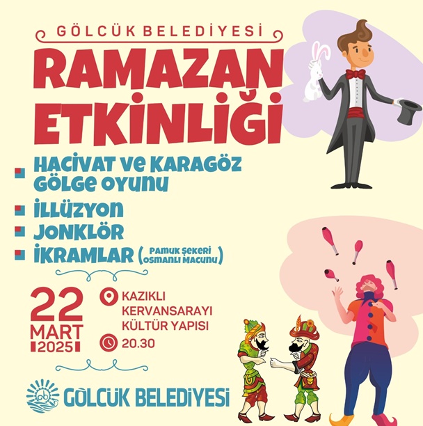 Gölcük Belediyesi geleneksel Ramazan etkinliklerini çocuklarla buluşturmaya devam ediyor. Bu kapsamda 22 Mart Cumartesi akşamı saat 20.30’da Kazıklı Kervansarayı Kültür Yapısı’nda Ramazan etkinliği düzenlenecek. Hacivat-Karagöz gölge oyunu, illüzyon, jonklör gösterileri ve ikramların olacağı etkinlikte, çocuklar ve aileleri keyifli bir akşam geçirecek.
