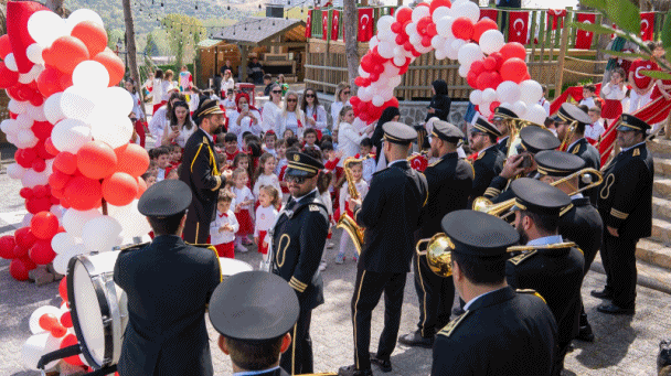 Kutlamalara gelen bando takımı, marşlar ve çocuk şarkıları eşliğinde alandaki coşkuyu zirveye taşıdı. Ellerinde bayraklarla bando takımına eşlik eden minikler, bayramın anlam ve heyecanını doyasıya yaşadı.