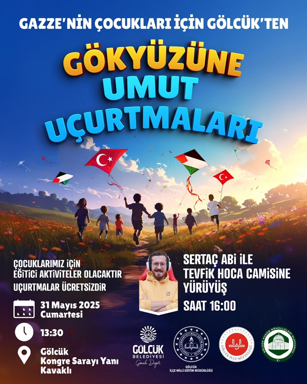 Gölcük Belediyesi ile Kudüs Gönüllüleri Platformu, 31 Mayıs 2025 Cumartesi günü anlamlı bir etkinliğe ev sahipliği yapacak. Kavaklı Gölcük Kongre Sarayı yanında düzenlenecek programda, çocuklar Gazze’deki yaşıtları için uçurtmalarını gökyüzüne bırakacak. Saat 13.30’da başlayacak etkinlikte dayanışmayı ve kardeşliği simgeleyecek uçurtmaları gökyüzü ile buluşturacak çocuklar, tüm dünyaya anlamlı bir mesaj verecek.