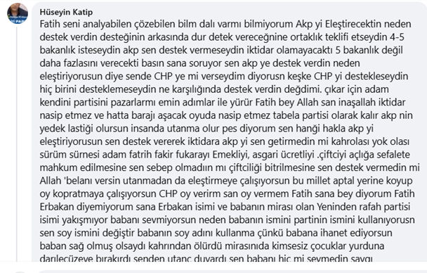 Fatih Erbakan’ın Facebook hesabından paylaştığı İl kongremize katılmak üzere yarın Kocaeli’deyiz inşallah şeklindeki paylaşımın altına çok sert sözlerle yorum yapanlar, hatta beddua edenler oldu. O isimlerden biri de Hüseyin Katip’ti.