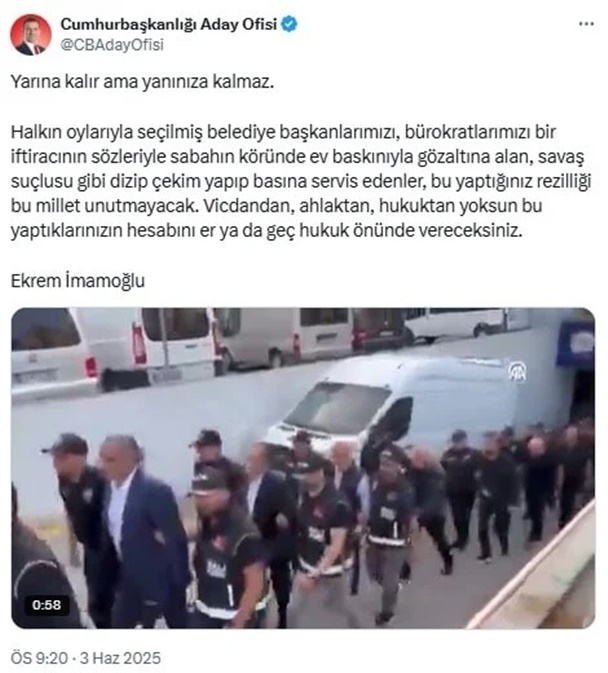 Siyaset, 03 Haziran 2025 11:08Tutuklu İBB Başkanı Ekrem İmamoğlu, İBB operasyonunda gözaltına alınan kişilerin görüntülerinin servis edilmesine sosyal medya hesabından çok sert bir tepki gösterdi. İmamoğlu "Vicdandan, ahlaktan, hukuktan yoksun bu yaptıklarınızın hesabını er ya da geç hukuk önünde vereceksiniz." dedi