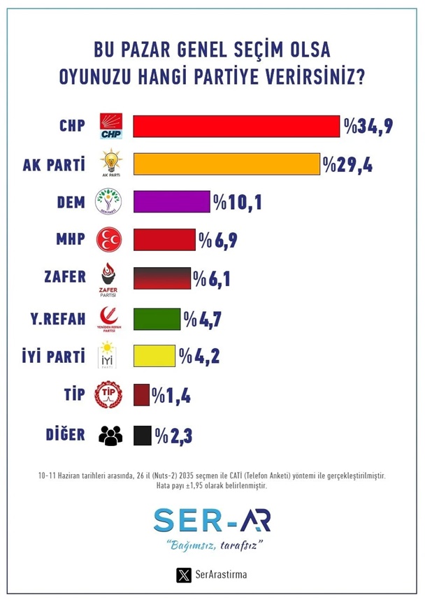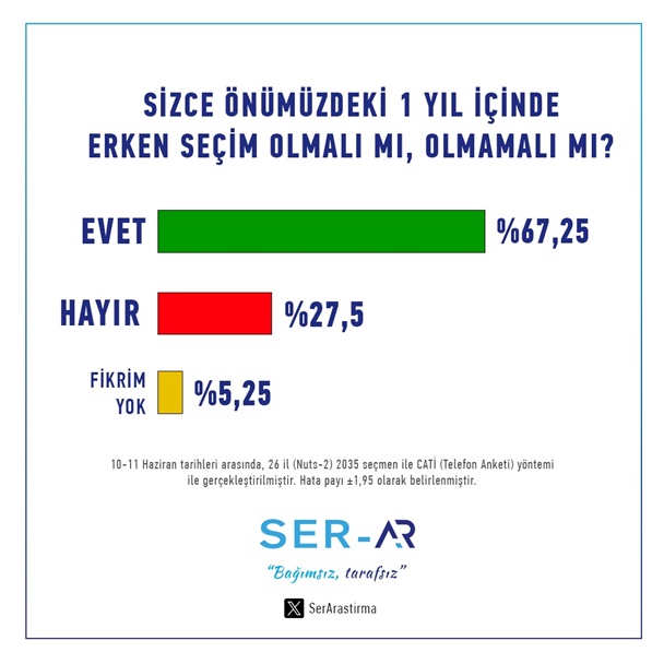 Ser Araştırma, 11-12 Haziran tarihleri arasında, 26 ilde 2 bin 35 seçmenle CATİ (Bilgisayar Destekli Telefonda Anket) yöntemiyle yaptığı anketin sonuçlarını kamuoyu ile paylaştı.