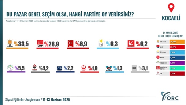 ORC’nin anketinde Kocaeli’de AKP’nin oyunun yüzde 33,5’e, MHP’nin de yüzde 6.9'a kadar düştüğü görüldü. CHP ‘de bir önceki seçime göre 5 puan artırarak yüzde 28,9'a yükseldi. Aynı ankette İYİ Parti’nin oyu 6.3, Yeniden Refah 6.2, Zafer Partisi 4.2 ve Büyük Birlik Partisi de 1,9.