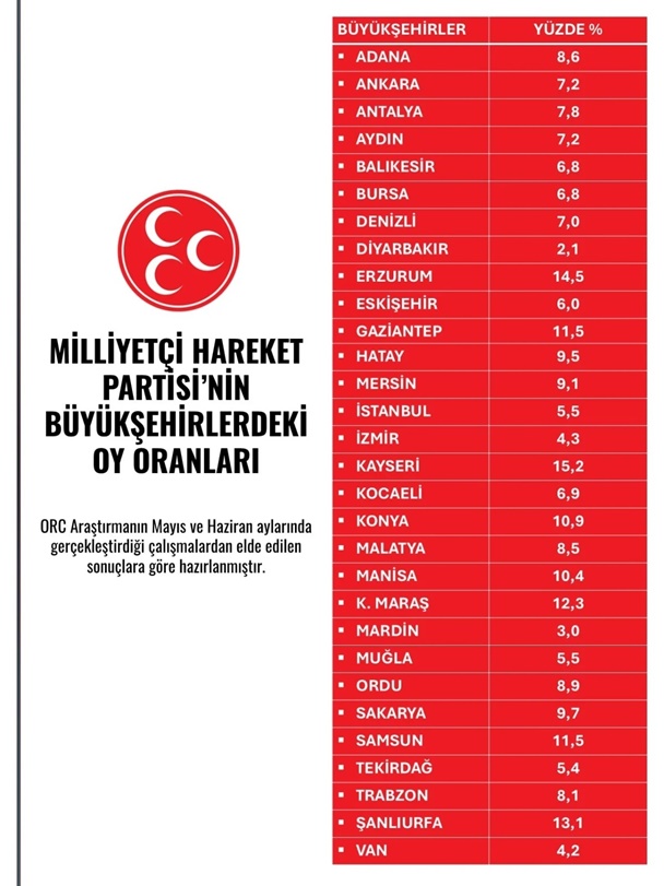 Araştırmada, AKP ve MHP'nin 30 büyükşehrin tamamında barajı geçtiği görülürken MHP'nin sonuçları dikkat çekti.