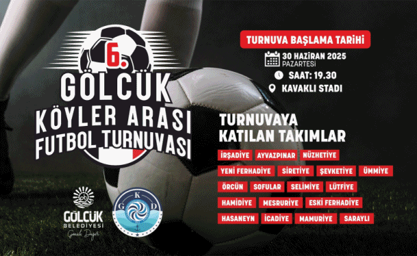 Gölcük Belediyesi’nin destekleri ve Gölcük Köyleri Derneği´nin organizasyonuyla düzenlenen olan Köyler Arası Futbol Turnuvası, bu yıl 6. kez sporseverleri bir araya getirecek. 30 Haziran Pazartesi günü saat 19.30’da Kavaklı Stadı´nda başlayacak olan turnuvada 18 köy takımı mücadele edecek. Her yıl olduğu gibi bu yıl da renkli ve çekişmeli maçlara sahne olacak olan turnuva, sunduğu seyir zevki ile köylerin tanıtımına da katkı sunacak.