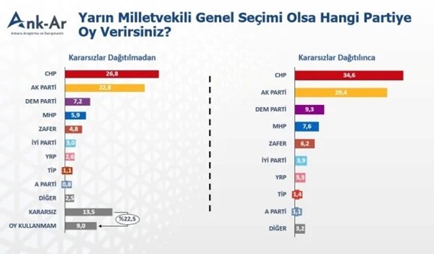 Siyasette yaşanan gelişmeler anketlerdeki dengeyi de değiştiriyor. Son yapılan ankette kararsızlar dağıtılınca CHP yüzde 34,6 oy oranına ulaşırken, AKP yüzde 29,4’de kaldı. CHP’nin AKP ile arasındaki fark 5 puanı bile aştı. DEM Parti yüzde 9,3 ile üçüncü sırada yer alırken, MHP’de hemen arkasında 7,6 puan ile bulunuyor.