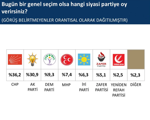 Ankette, yüzde 36.2 ile CHP'nin birinci parti olduğu AKP'nin oy oranının ise yüzde 30.9 olduğu görüldü.