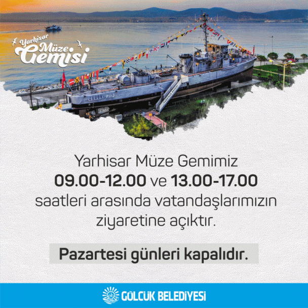 Geçen yıl tamamen yenilenen Gölcük Belediyesi Yarhisar Müze Gemisi’nin ziyaret günlerinde düzenlemeye gidildi. Daha önce haftanın 3 günü ziyarete kapalı olan gemi, yapılan yeni düzenleme ile 6 gün ziyarete açık kalacak. Sadece pazartesi günleri kapalı kalacak olan Yarhisar Müze Gemisi, 09.00-12.00 ve 13.30-17.00 saatleri arasında ziyaret edilebilecek.