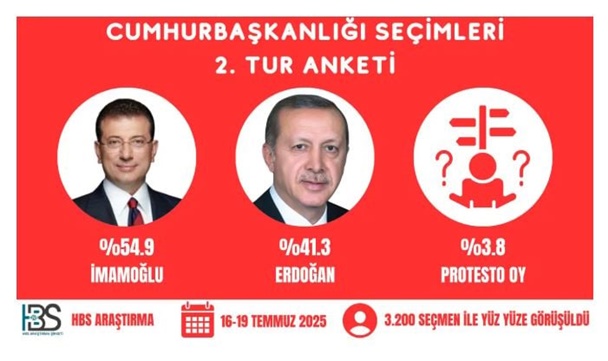 HBS Araştırma’nın 16-19 Temmuz 2025 tarihleri arasında 3 bin 200 seçmenle yüz yüze gerçekleştirdiği “Cumhurbaşkanlığı Seçimleri 2. Tur Anketi” sonuçları kamuoyuyla paylaşıldı.
