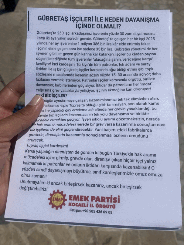 Çağrıda “Gübretaş' ta çalışan her bir işçi 2025 yılında her ay işverenine 1 milyon 386 bin lira kâr elde ettirmiş fakat işçinin eline geçen para ise sadece 35 bin lira. Gübretaş yönetimi de her işveren gibi her geçen gün karına kâr katarken, işçiler bu kârdan payına düşeni istediğinde tüm işverenler "alacağına şahin, vereceğine karga" kesiliyor. İşçi kardeşim, Türkiye'de tüm patronlar; tek adam ve saray iktidarı ile iş birliği içinde, işçiler karsısında ağız birliği etmiş gibi toplu sözleşme masalarında kesenin ağzını yüzde 15- 30 arasında açıyor; daha fazlasını vermek istemiyor. Patronlar işçiler karşısında örgütlü, birlikte davranıyor, birbirlerinden güç alıyor. İktidar da patronların her 'imdat' çağrısına grev yasaklaryla yetişiyor, işçinin ekmeğine kan doğruyor” ifadeleri yer aldı.