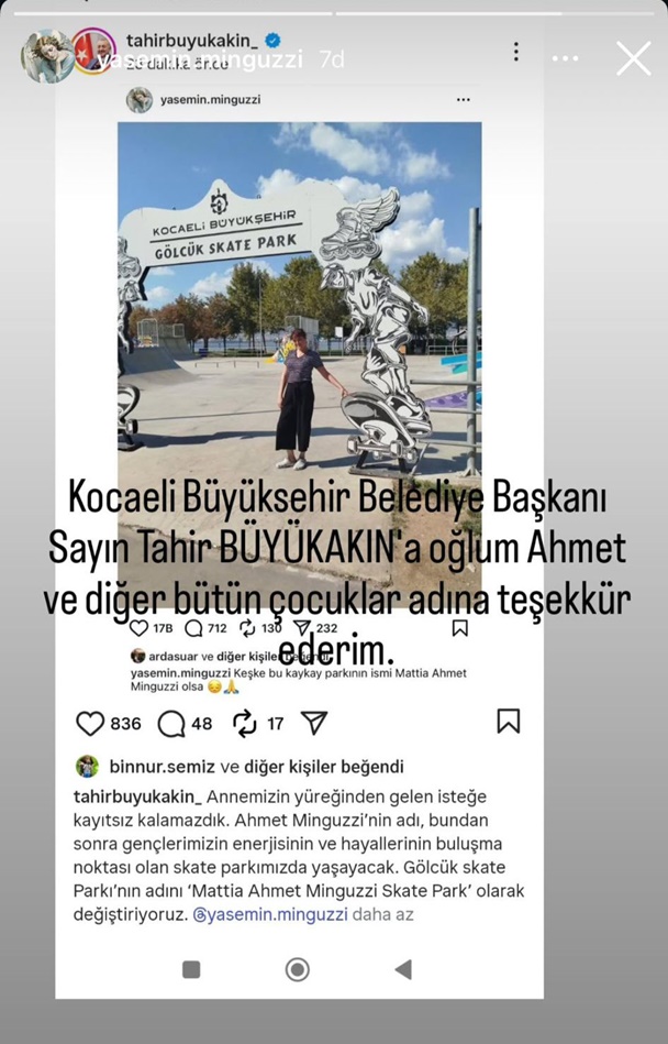 Başkan Tahir Büyükakın’ın bu duyarlı tavrı büyük alkış toplarken, anne Yasemin Minguzzi’den de teşekkür geldi. Oğlunun isminin Gölcük’teki kaykay parkına verilecek olmasından son derece mutlu olduğunu belirten anne Minguzzi, “Kocaeli Büyükşehir Belediye Başkanı Sayın Tahir Büyükakın’a, oğlum Ahmet ve diğer bütün çocuklar adına teşekkür ederim” dedi.