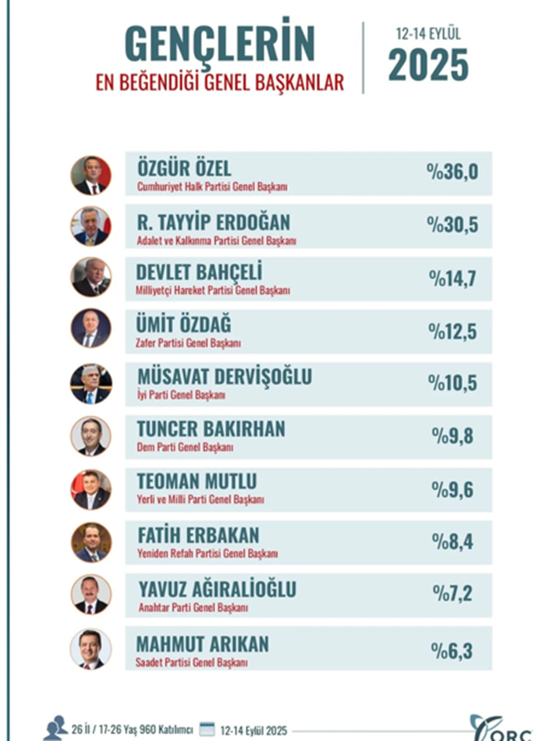 Türkiye'de kamuoyu araştırmalarına her gün bir yenisi daha ekleniyor. ORC Araştırma 12-14 Eylül tarihleri arasında yaptığı kamuoyu yoklamasında 26 ilden 17-16 yaş arası 960 gence "Gençlerin en beğendiği genel başkanları kim?" sorusunu yöneltti.