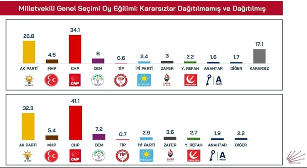 Kararsızlar dağıtıldığında ise CHP'nin yüzde 40'ı aşarak yüzde 41,1 seviyesini gördüğü AKP'nin oy oranının ise yüzde 32,3 seviyesinde kaldığı görüldü.