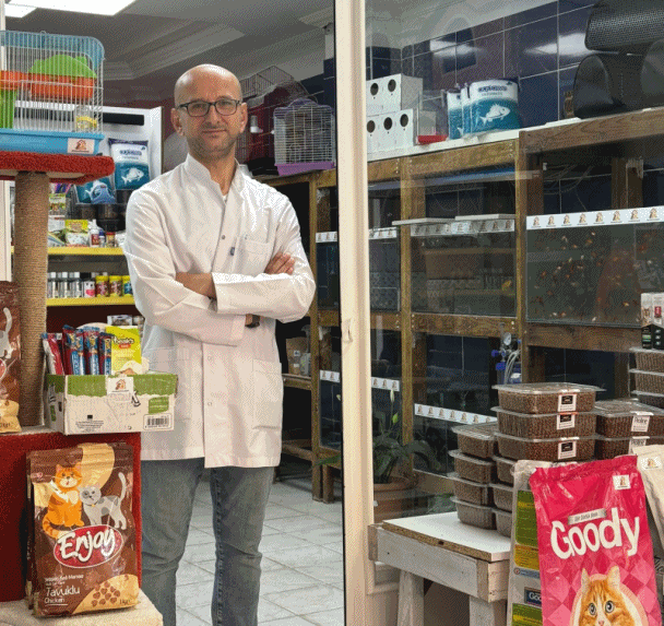 Bu marketin yöneticisi Muzaffer Bağışlıoğlu aynı zamanda uzman bir veteriner hekim. Bağışlıoğlu, kapısına gelen can dostlarına adeta bir çocuk gibi şefkat göstererek muayene edip teşhislerde koyabiliyor.