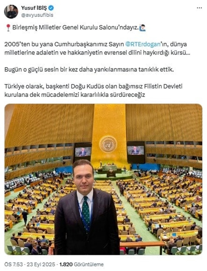 AKP Gençlik Kolları Başkanı Yusuf İbiş, sosyal medya hesabından "Birleşmiş Milletler 80. Genel Kurulu’na katılmak üzere New York’tayız" mesajıyla Türkevi’nde çekilen bir fotoğraf paylaştı. İbiş’in üzerinde “Türkiye Cumhuriyeti Cumhurbaşkanlığı” ibaresi taşıyan yaka kartı takması, sosyal medyada çeşitli tepkilere neden oldu.
