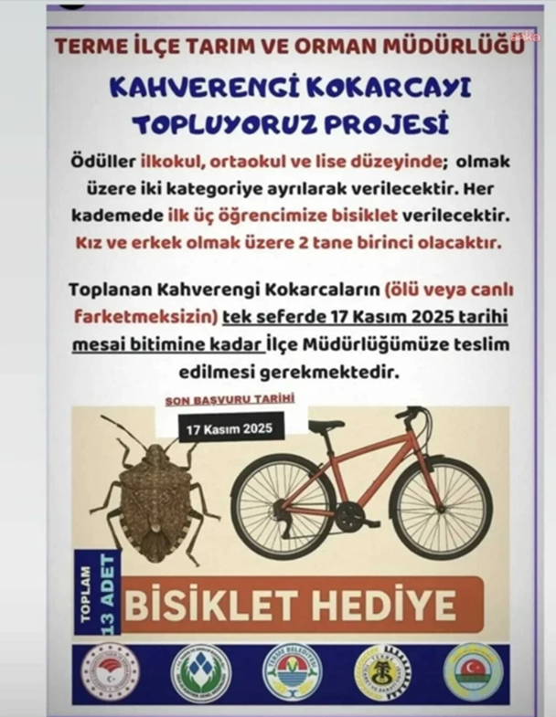 Terme İlçe Tarım ve Orman Müdürlüğü'nce, “Haydi çocuklar kokarcaya, bu zekânın karşısında kim durabilir?” sloganıyla "Kahverengi Kokarcayı Topluyoruz Projesi"ne başlatıldığı duyuruldu. "Proje" kapsamında ilkokul, ortaokul ve lise düzeyinde düzenlenecek yarışmada en fazla kahverengi kokarca toplayan öğrencilere bisiklet hediye edileceği açıklandı.