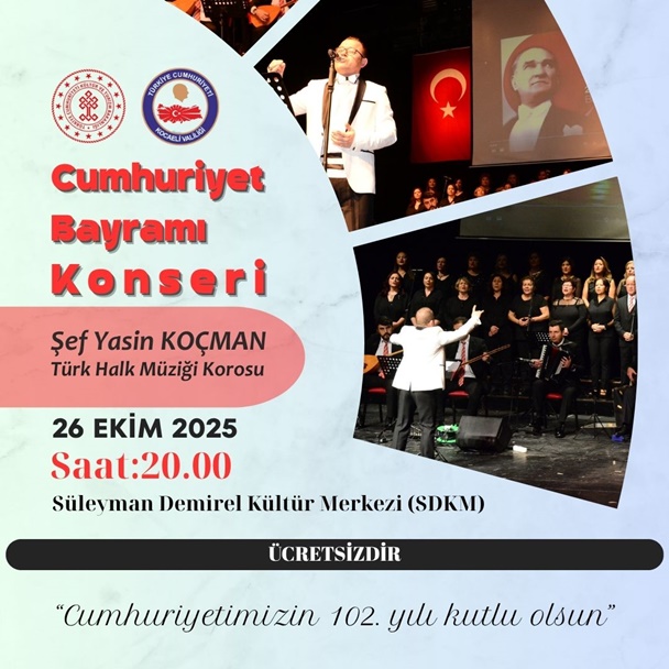 Kocaeli Valiliği İl Kültür ve Turizm Müdürlüğü ev sahipliğinde düzenlenecek Cumhuriyet Bayramı Konseri, 26 Ekim 2025 Pazar günü saat 20.00’de Süleyman Demirel Kültür Merkezi (SDKM) sahnesinde gerçekleştirilecek. Şef Yasin Koçman yönetimindeki koro, Türk halk müziğinin seçkin eserlerini seslendirerek Cumhuriyet coşkusunu sanatla buluşturacak. Bu güzel konser akşamına davetlisiniz….