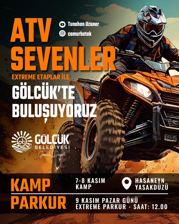 Heyecan dolu parkurda, ATV sürücüleri hünerlerini sergileyecek. Gölcük Belediye Başkanı Ali Yıldırım Sezer, tüm ATV tutkunlarını Hasaneyn Yasakdüzü’nde düzenlenecek etkinliğe davet etti.