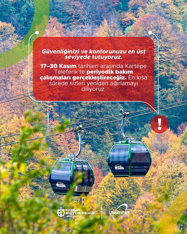 Gündem, 16 Kasım 2025 10:24Kocaeli Büyükşehir Belediyesi iştiraki UlaşımPark tarafından işletilen Kartepe Teleferik, kış sezonu öncesinde genel bakıma giriyor. Tesis, 17-30 Kasım tarihleri arasında 14 gün süreyle bakımda olacağı için hizmet veremeyecek.