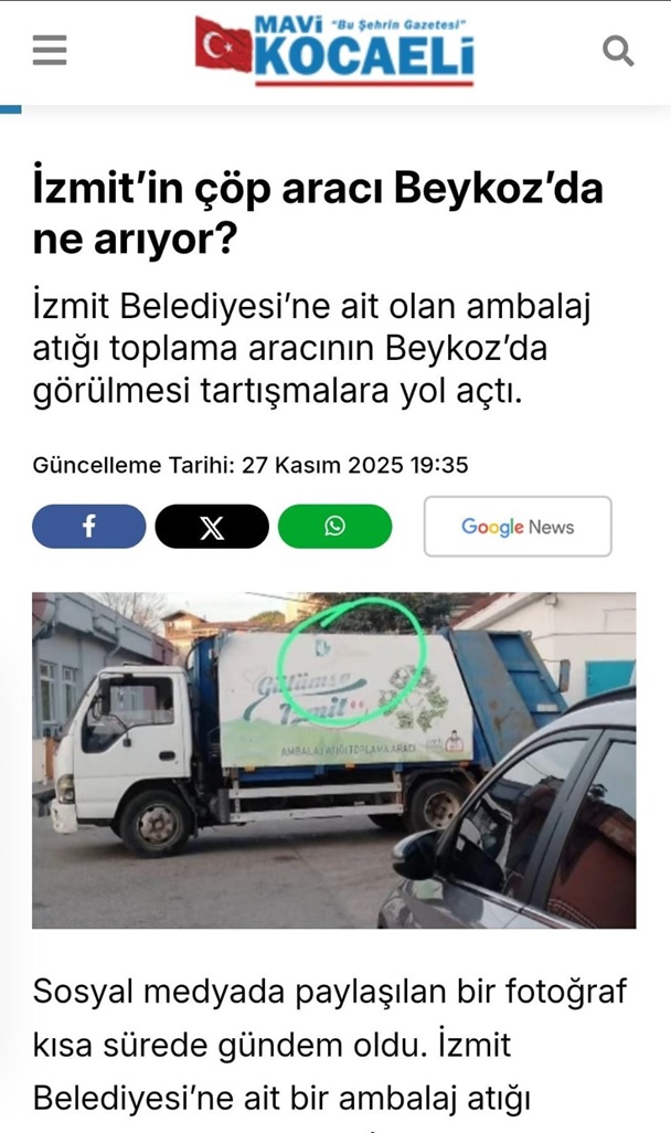 Bazı basın yayın organları ile sosyal medyada yer alan “İzmit’in çöp aracı Beykoz’da görüntülendi” başlıklı haberler gerçeği yansıtmamaktadır. Habere konu olan araç, İzmit Belediyesi’nin mülkiyetinde değildir ve belediyemizle herhangi bir bağlantısı bulunmamaktadır.