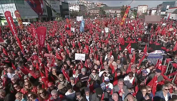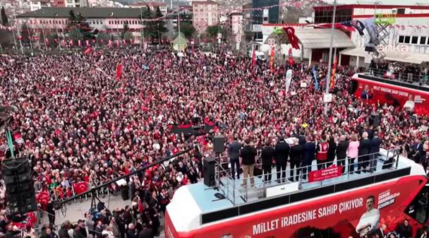 Ocak ayında faiz ödemeleri bir önceki yıla göre yüzde 180 arttı. Geçen sene Ocak’ta 163 milyar faiz ödemiştik, bu sene 456 milyar. İnanılmaz bir rakam! İnsan şöyle düşünüyor: 'İnşallah çok para buldular, çok faiz ödüyorlar, yatırımlar artmıştır.' Oysa ki yatırımlar geçen seneye göre Ocak ayında yüzde 37 azalmış. Düşünün ki bu bir şirket olsa; çağırsan şirketi yöneteni, 'Gel bakalım müdür efendi, nedir durum? Faiz ödememiz ne oldu?' 'Efendim 160’tı, 456 oldu.' 'Üretim?' 'Üretim yüzde 37 azaldı.' Bunu diyen adamı aklı başında kimse şirketinin başında tutmaz! Bu hesaba Türkiye’yi getiren adamı bu memleketin başında tutacak mısınız? Faiz lobilerine çalışan, yatırım yapmayan, işçisini, emekçisini, emeklisini düşünmeyen, gençlerini hayata küstüren bu iktidarı ilk seçimde gönderecek miyiz? İşte bu kararlılık, bu azim, bu farkındalık her şeyden kıymetli. Bakın, vergi adaletsizliğinde biraz önce söyledim, Avrupa’da birinciyiz."