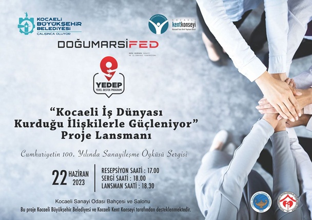 İş Dünyası, 14 Haziran 2023 11:10Kocaeli Kent Konseyi'nin Yerel Destek Programı (YEDEP) kapsamında, Doğu Marmara Sanayi ve İş Dünyası Federasyonu (DOĞUMARSİFED) tarafından sunulan "Kocaeli İş Dünyası Kurduğu İlişkilerde Güçleniyor" başlıklı projenin lansman toplantısı için sizleri de aramızda görmekten mutluluk duyarız.