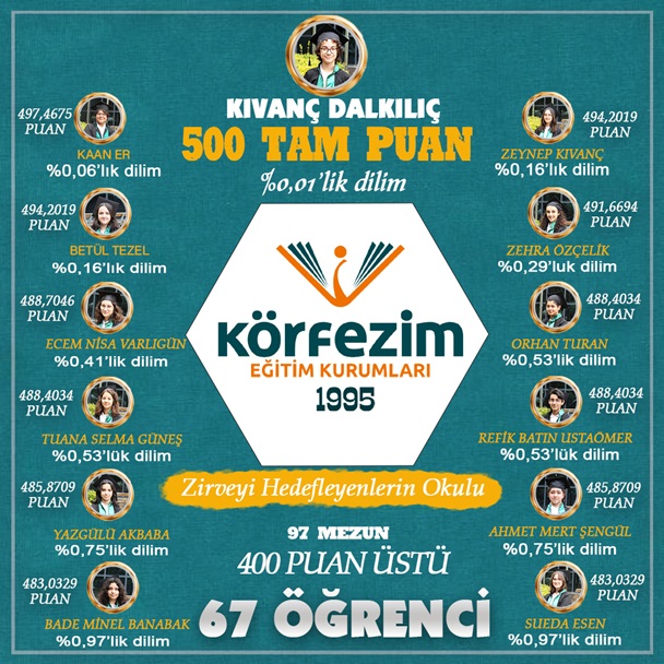 Körfezim Eğitim Kurumları öğrencisi Kıvanç Dalkılıç, LGS’de 500 tam puan yaparak Türkiye Birincisi oldu. Okulun 97 öğrencisinin 67‘si 400 puan ve üstü puan aldı.Öğrencilerinin % 13’ü %0,01- %1’lik dilimde, %25’i %0,01- %2’lik dilimde, %30’ü %0,01-%3’lük dilimde yer alan Körfezim Eğitim Kurumları’nda sınav başarısı çok yüksek oldu.