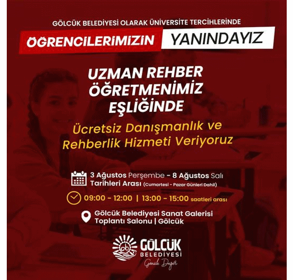 Üniversite adaylarına bilinçli ve doğru bir şekilde tercih yapmalarına destek olacak Tercih Danışmanlık Merkezi; 3-8 Ağustos tarihleri arasında (cumartesi ve pazar günleri dahil) tarihlerinde, saat: 09.00–12.00, 13.00–15.00 saatlerinde hizmet verecek. Gölcük Belediye Başkanı Ali Yıldırım Sezer, öğrencilere yapacakları tercihlerin hayırlı olmasını diledi.