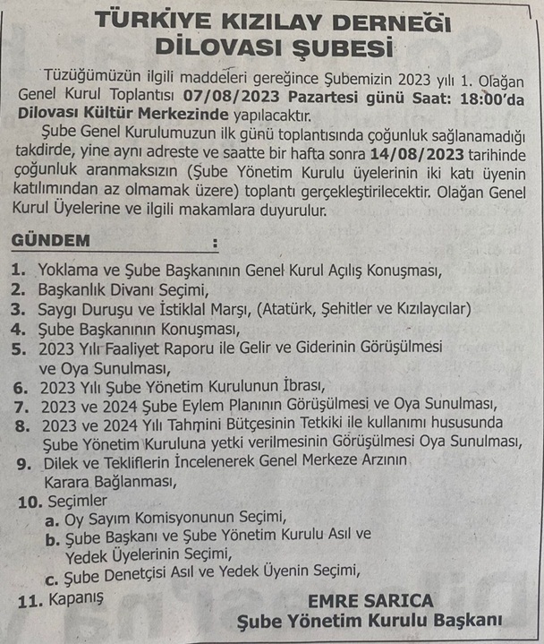 Kızılay tüzüğü gereğince Dilovası Şubesi’nin 2023 yılı 1. Olağan Genel Kurul Toplantısında; 2023 Yılı Faaliyet Raporu İle Gelir ve Giderlerinin Görüşülmesi ve Oya Sunulması, 2023 Yılı Şube Yönetim Kurulunun İbrası, 2023 ve 2024 Şube Elem Planının Görüşülmesi ve Oya Sunulması, 2023 ve 2024 Yıl Tahmini Bütçesinin Tetkiki İle Kullanımı, Şube Yönetim Kuruluna Yetki Verilmesinin Görüşülmesinin Yanı Sıra Oy Sayım Komisyonunun Seçimi, Şube Başkanı ve Şube Yönetim Kurulu Asil ve Yedek Üyelerinin Seçimi, Şube Denetçisi Asil ve Yedek Üyenin Seçimi yapılacak.