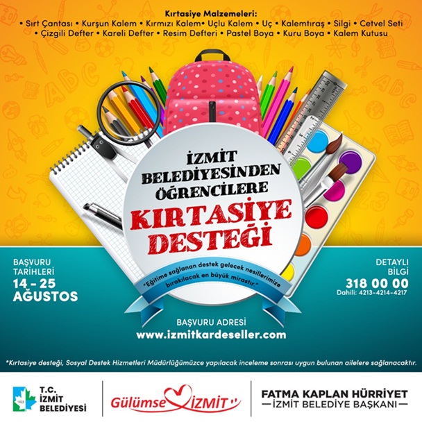 İzmit Belediyesi Sosyal Destek Hizmetleri Müdürlüğü, eğitimde fırsat eşitliğini sağlamak ve her çocuğun nitelikli eğitim ihtiyacına cevap verebilmek amacıyla yeni eğitim öğretim sezonunda öğrencilere kırtasiye malzemesi desteği sağlayacak. 14-25 Ağustos tarihleri arasında www.izmitkardeseller.com web sitesi üzerinden başvuru alacak olan Sosyal Destek Hizmetleri Müdürlüğü, alınan başvuruları sosyal hizmet uzmanlarınca sosyo-ekonomik açıdan değerlendirmeye tabii tutacak. Uygun bulunan ihtiyaç sahibi ailelere de kırtasiye malzemesi desteği sağlanacak.