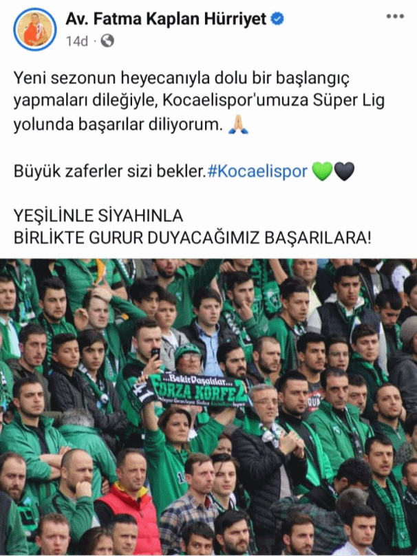 İzmit Belediye Başkanı Fatma Kaplan Hürriyet yarın, Lig’de ilk müsabakasına çıkacak Kocaelispor'a başarı dileğinde bulundu. Hürriyet, paylaşımında şu ifadeleri kullandı: "Yeni sezonun heyecanıyla dolu bir başlangıç yapmaları dileğiyle, Kocaelispor'umuza Süper Lig yolunda başarılar diliyorum. Yeşilinle Siyahınla birlikte gurur duyacağımız başarılara!"