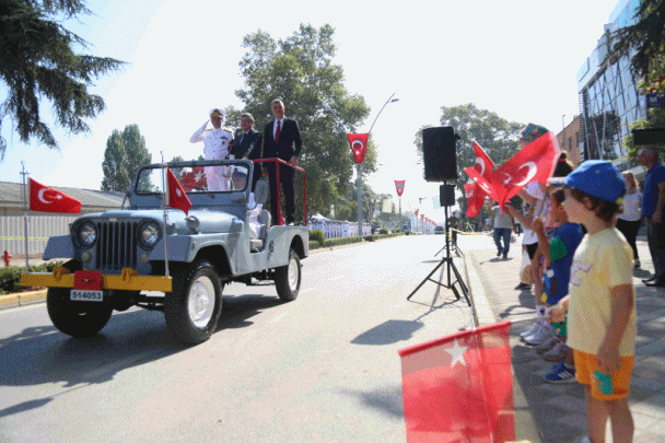 30 Ağustos Zafer bayramı kutlama programı daha sonrasında Mareşal Fevzi Çakmak Caddesi üzerinde düzenlenen tören ile devam etti. Tören Kocaeli Vali Yardımcısı Gölcük Kaymakam Vekili Ali Ada, Gölcük Deniz Ana Üs ve Garnizon Komutanı Tuğamiral Ali Tuna Baysal, Gölcük Belediye Başkanı Ali Yıldırım Sezer’in katılımcıları selamlaması ile başladı. İlçe protokolünün yerlerini almasını ardından tören 1 dakikalık saygı duruşu ve Donanma Bandosu eşliğinde İstiklal Marşı’nın okunması ile devam etti.