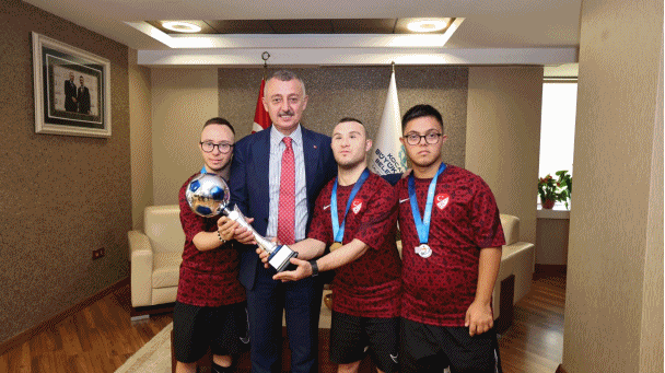 İtalya’daki Down Sendromlular Avrupa Şampiyonası’nda Portekiz’i yenerek şampiyon olan Down Sendromlular Özel Futsal Milli Takımı, kazandıkları kupayla birlikte Kocaeli Büyükşehir Belediyesini ziyaret etti. Mehteran Takımı ve Kağıtsporlu sporcular tarafından meşalelerle karşılanan Milli Takım için Büyükşehir Belediyesi ana hizmet binası önünde tören düzenlendi. Türkiye’nin gururu olan Down Sendromlular Özel Futsal Milli Takımı oyuncuları kazandıkları kupayı söz verdikleri gibi Kocaeli Büyükşehir Belediye Başkanı Tahir Büyükakın’a getirdi.